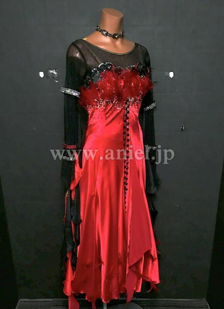 赤のサテンボディに黒メッシュの上半身がシックなデザインのドレスです。