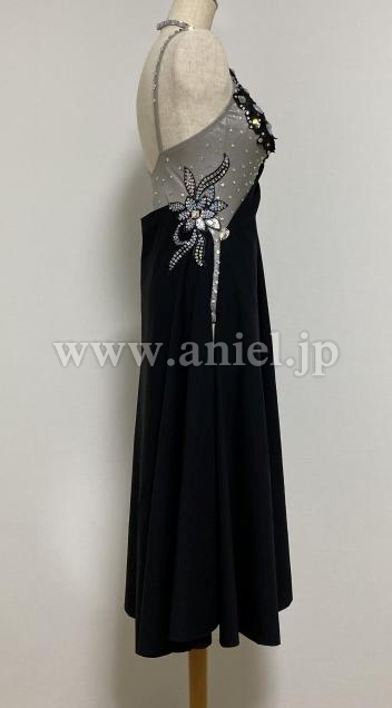 ボディに沢山石が付いたドレスで黒い生地が露出をカバーするデザインです。