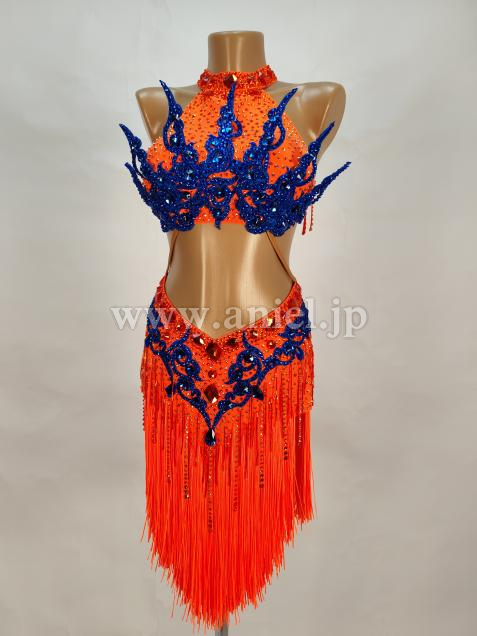 鮮やかなオレンジにブルーの装飾のコントラストが派手なドレスです。