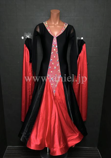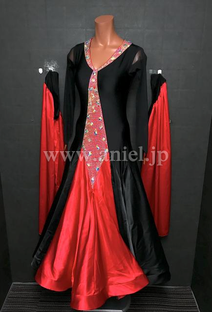 黒と赤のコントラストが目立つバイカラードレス。
