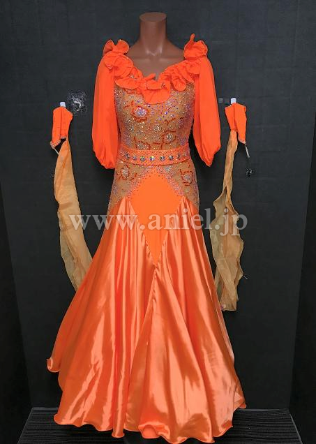オレンジのオフショルダーデザインがキュートなドレスです。