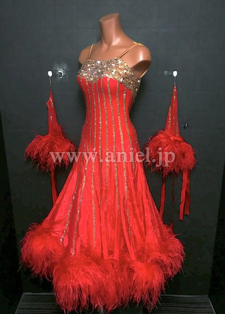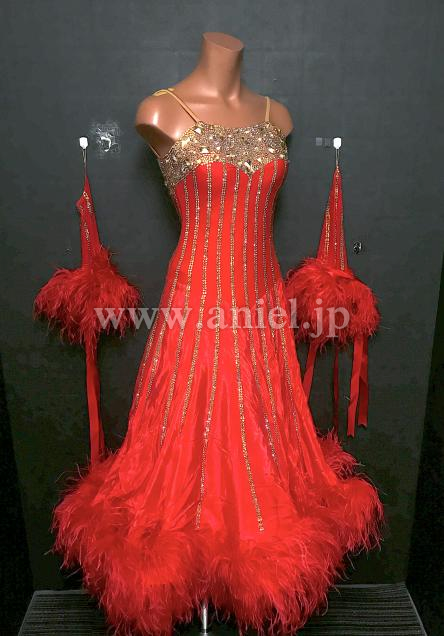 鮮やかな赤に美しいゴールドストーンのラインがキラキラと輝くドレスです。