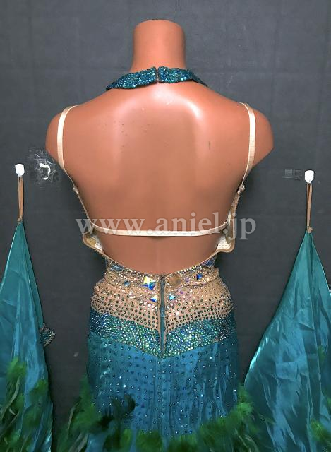 スカートとフロートに、羽根がびっしり付いていて、大変豪華で華やかな目立つドレスです。