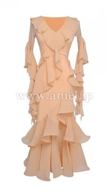 袖や胸元、スカートにたくさん施されたフリルが動きを出してくれるワンピースです。