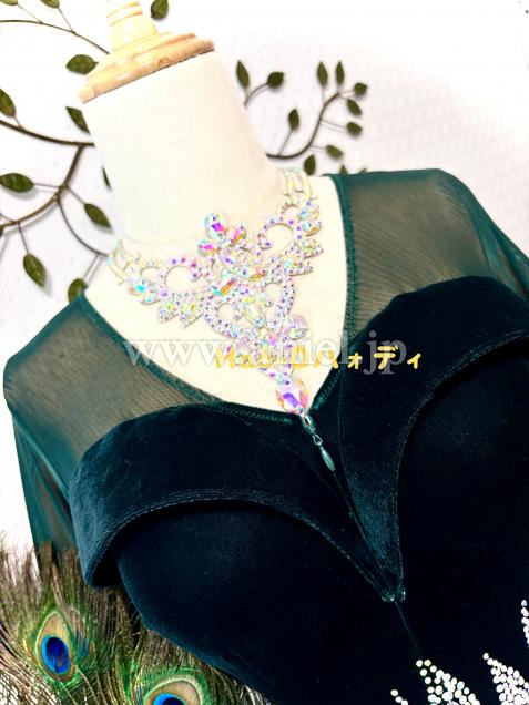 カーブラインの立体胸元、流れる深Vラインのバックデザイン、しなやかなボディラインを引き立て、洗練された印象を与える