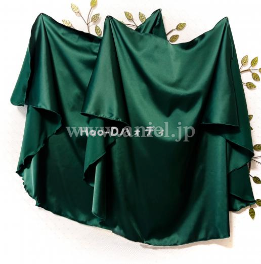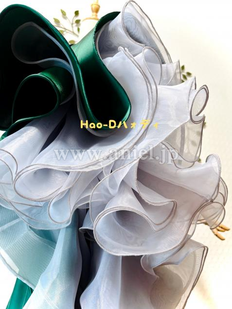 ダンクグリーンのサテン生地1枚、ライトグレーのオーガンジー生地2枚、ボリュームアップにベース地にオーガンジー生地の短い段をさらに2段付け