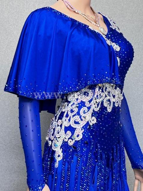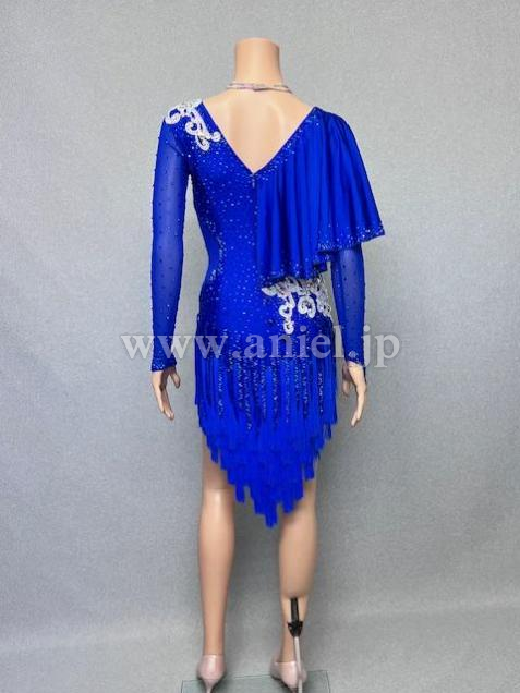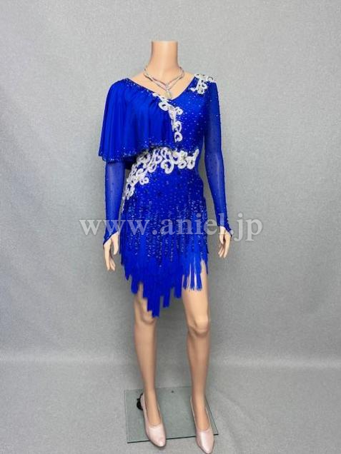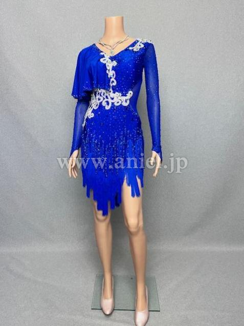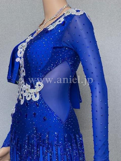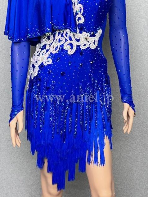 ドレス全体にたっぷりラインストーンをあしらい、右袖ドレープや、スカートのフリンジにはその上に更にラインストーンフリンジを重ねた、とても手の込んだデザインになっています。