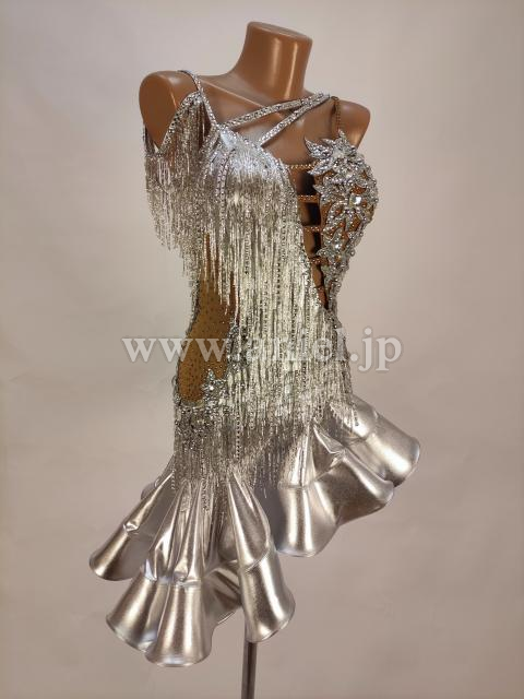 シルバーメタリックのフレアスカートが踊るドレスです。