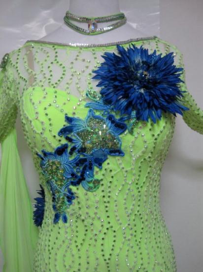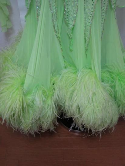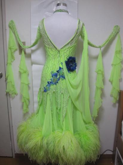 蛍光黄緑に大量のスワロフスキーがついたとても目立つドレスです。ダークターコイズの花とスパンとスワロフスキーがポイントです。オーストリッチが裾に豪華についており、よく舞います。袖がついているので、腕を出したくないかたにおすすめです。腕の部分は透け感のある模様になっているので、腕の細さや太さをカバーできます。フロートは切りっぱなしで簡易的にとめてあるだけですので、必要に応じて処理をしてください。石取れはほとんどありません。状態もよいです。