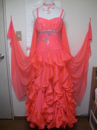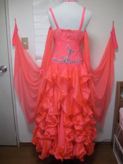 とても鮮やかで目立つピンクがかったオレンジのドレスです。スカートにボリュームがあり、よく舞います。クリスタルと赤のスワロフスキーストーンを使用しています。胸元をもっと豪華にしたい場合は大粒ストーンの追加やスパン生地をバストまわりに縫い付ける等のリメイクが可能です(15,000円〜)。裾上げは10,000円にて承ります。手作りのため、縫製がゆるい部分があります。クリーニング、ストーンメンテナンス済です。