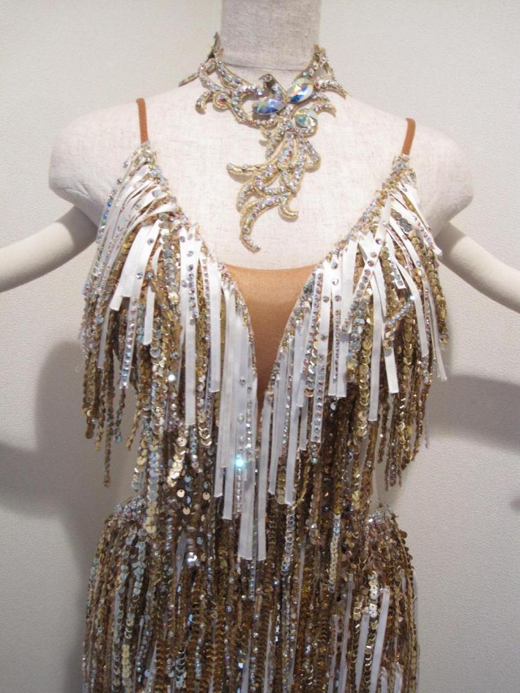 白とゴールドスパンとストーンがついた生地フリンジがとても豪華で存在感のあるドレスです。アクセサリーも石がビッチリです。