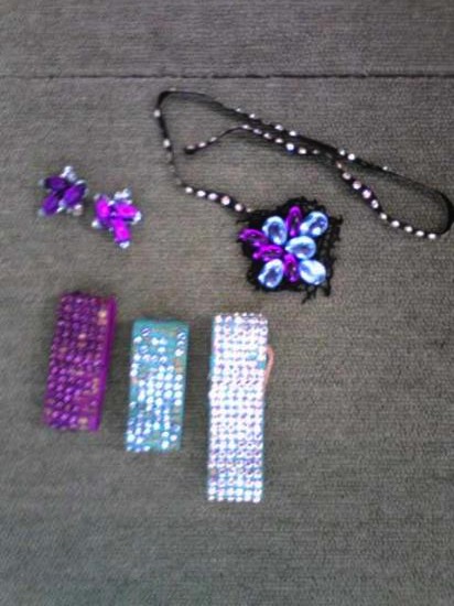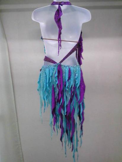 水色と紫の布がグラデーションのようにちりばめられて個性的なデザインです。ウェストのカットがシャープで細く見えます。付属品(髪飾り、イヤリング、腕輪)付き。