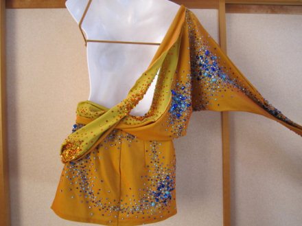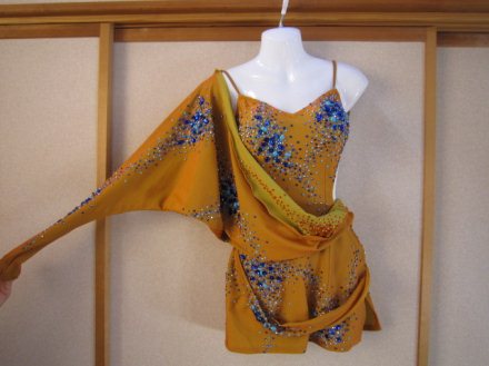 伸縮性がありオレンジ系生地にブルーの石が目立ちます。スカート丈は短めでちょっと変わったデザインです。同生地に石がついたチョカーとリストバンドがあります。プロA級の方に譲り受けたドレスです。
