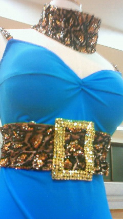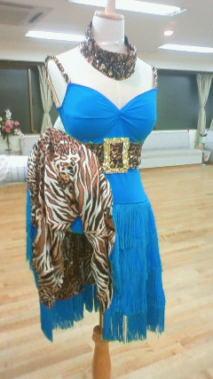 ベルト・腕輪・ターバンに石をたくさん付けたので会場でキラキラします。そしてフリンジがよく動きます。裏生地がヒョウ柄です。まだ新品同様石がびっしりです。