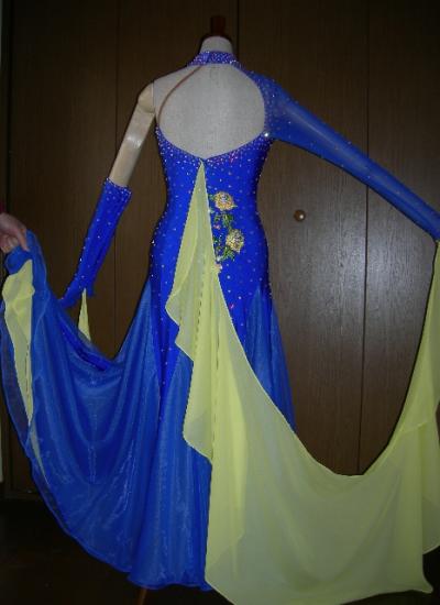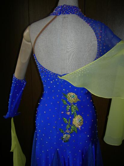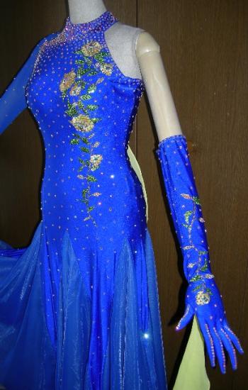 自分用にオーダーしましたが色違いの他のドレスを着る事になりました。ロイヤルブルーのドレスに黄色のモチーフが付いています。左のグローブは五本指の手袋。石はスワロフスキーがたっぷり散りばめられています。スカートの中はフロートと同じライトイエローです。このお値段ならなかりお買い得です。