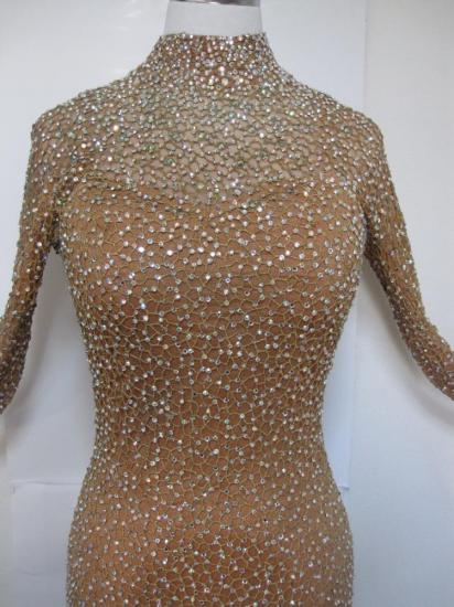 全身にスワロフスキーストーンのついたとても豪華なドレスです。ネット全てに石がついているため、ドレス自体は多少重いのですが、とてもラインがきれいにみえるドレスです。スカート部分はリメイクをしてあり写真の通りで、一番上のドレス総丈が118cmで、一番下がそれに+10cmくらいです。スカートに紫を入れて少し全体の印象を締めています。少し古いドレスですので、格安でお譲りいたします。