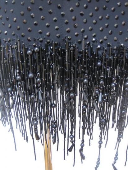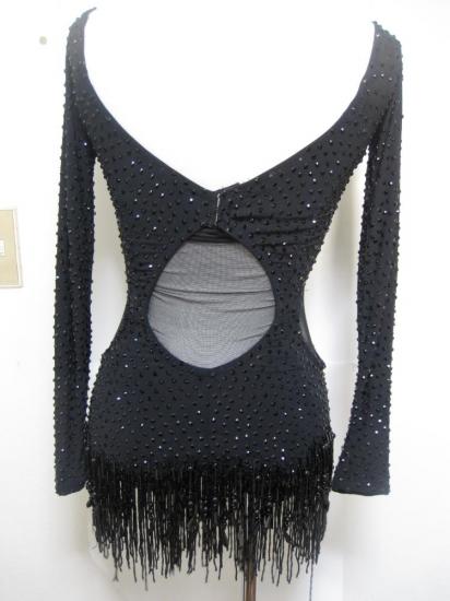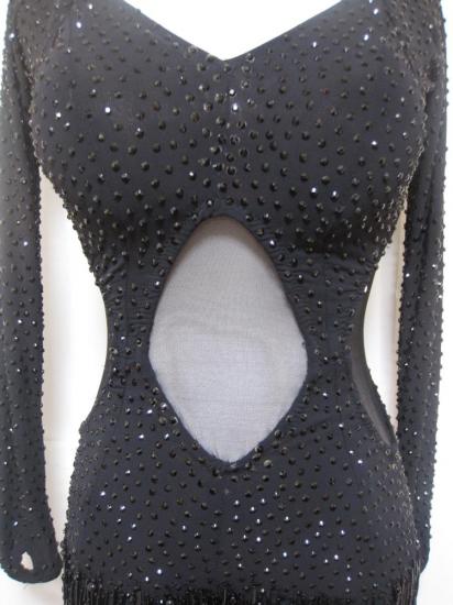 黒の石が全身に貼ってある豪華なドレスです。スカートは黒のビーズフリンジです。お腹とサイドに黒ネットを張っています。