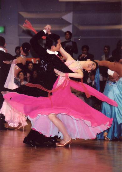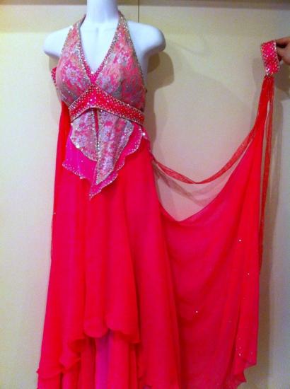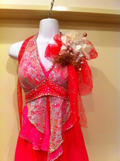 大きいフロートとリボンが舞い、また色も明るく良く目立つドレスです。若々しく着れます。デモンストレーション時には大きなコサージュを付けることもできます。