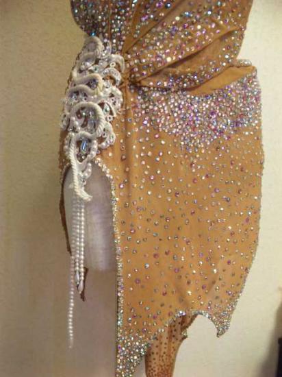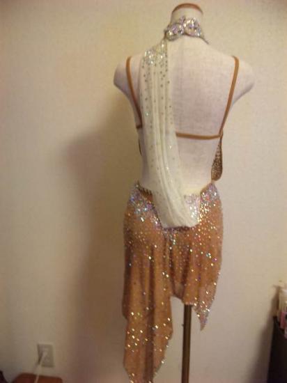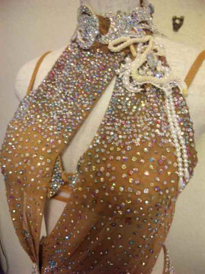 素材はストレッチ素材なのでとても着やすいです。ドレス全面にオーロラやピンクのスワロフスキーラインストーンが大量に豪華についています。少し石取れがあります。