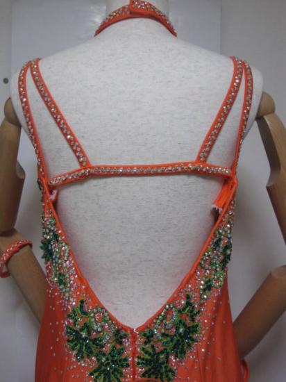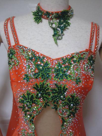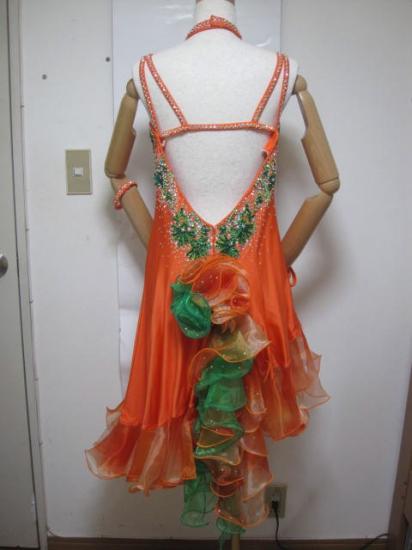 鮮やかなオレンジがフロアに映えます。スカートのフリルがよく舞います。お腹の部分には肌色ネットがついておりキレイに見せてくれます。腕輪、チョーカー、イヤリング、髪飾り付きです。