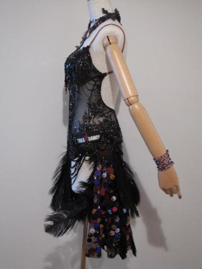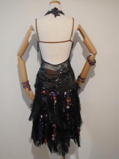クリーニング、メンテナンス済みです。上身頃には黒のシースルーにモチーフ&黒のスワロフスキーストーンが張り巡らされ、スカートはピンク系のスパンコールがついているジョーゼットの上にピーコックの羽がついており、とにかくなんとも言えないほど豪華で凝ったドレスです。
