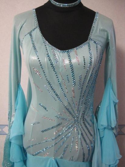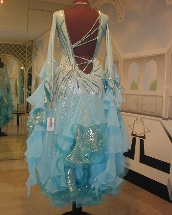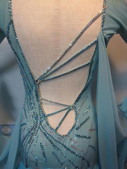 上半身は少し光沢のあるライクラ、スカートは水色のシルク地とキラキラのブルー系のシルク混の4枚重ねとなっています。背中のクロスしたストラップが後姿に印象を与えています。ドレスはイタリアのアトリエで石の補修などすべて手入れを済ませており大変良い状態です。石はスワロフスキーです。附属品:ネックレス、イヤリング、ヘアアクセサリー、キモノ(新品、色指定は不可)、ケース(ロング衣装ケース、大バッグ、小バッグ計3個)は新品をおつけします。レンタルはデモのみです。<>