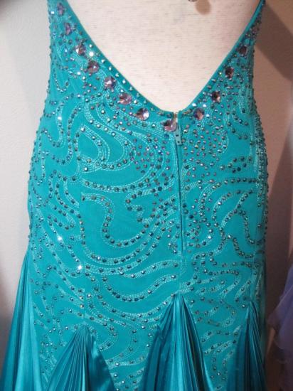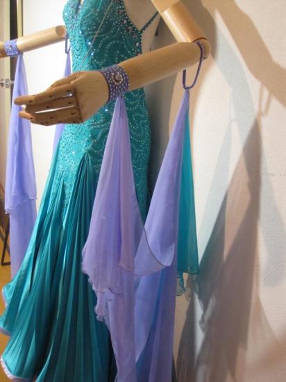 フランコ・フォーミカとオクサナ・レベデフの衣装を制作しているドレスメーカー製です。スカートはグリーンのストレッチサテン素材で、プリーツ加工がされていてボリュームたっぷりで大変美しく、紫のオーガンジー素材で制作したボリュームたっぷりですが軽くてよく踊るパニエが下に入っています。フロートは2パターンあり、1つは手袋と白フロート(未使用)、もう1つは紫とブルーグリーンの腕輪のフロートで、表情がかなり変わります。髪飾り・イヤリングが付属しています。