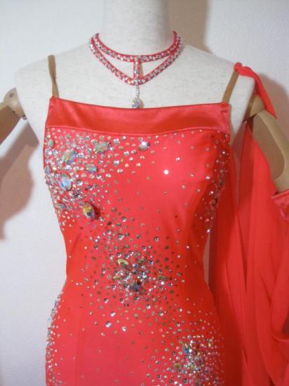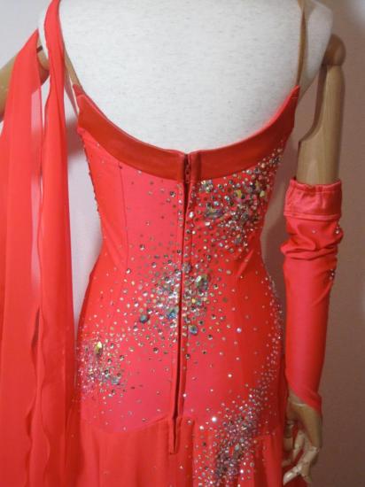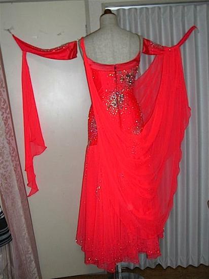 ブラックプールでも着用されたドレスを中古で購入。購入後の使用期間は半年です。非常にキレイな蛍光赤で石も目立ちます。フロートとネック周りを新しくしています。ストーンメンテナンス済です。