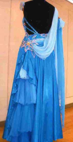 サテン生地で鮮やかなターコイズブル-ですが、薄い水色のジョーゼットのドレープがからんでいて強さの中にやわらかさがあります、また一部テイアードになっているスカートも変化があって素敵です、スワロが沢山ついた、花形のモチーフがとても綺麗です。青も何色か使っているので飽きないと思います