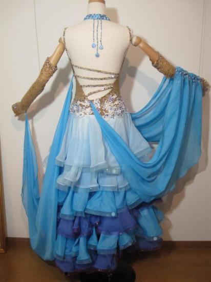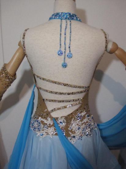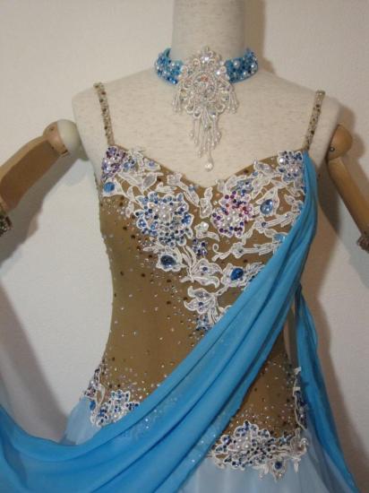 水色と紫の色使いがキレイでキュートなドレスです。ボディや水色と紫の色使いがキレイでキュートなドレスです。ボディやフロートには様々な色の石が使われておりとても豪華です。スカートもよく舞います。背中のデザインも凝っていて、背中が気になる方にもおすすめです。ボディと手袋が肌色なので、露出を控えながらも大胆な印象でとても目立ちます。