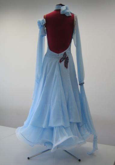 装飾は少ないですが、ボディの部分のデザインが凝っていて、スリムに見せてくれます。アイスブルーの上品なドレスで、軽やかに踊ります。背中にゴム等が通せるように金具が付いています。
