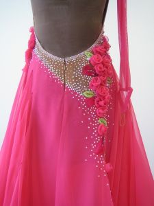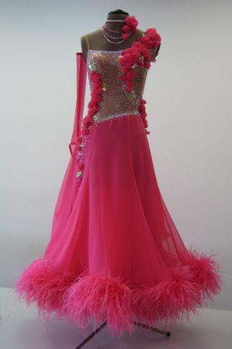 ベージュのボディにハンドメイドのバラが施されています。スカートはジョーゼットで、裾に贅沢なボアが付いています。