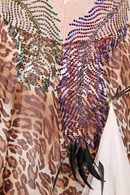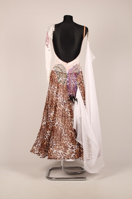 ボディにはスワロフスキーで孔雀の羽が描かれ、豹柄のスカートへと繋げています。とても個性的で強く見せることのできるドレスです。