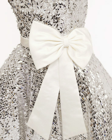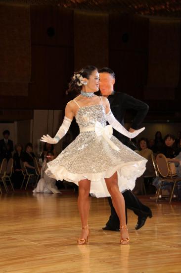 購入したパーティドレスを、社交ダンス用にヤナギダダンスウエアさんで加工してもらいました。総スパンコールでよく光ります。スカート内側にチュールがあしらわれ、ふんわりとした女性らしい美しいシルエットを演出し、ウエストに付いた大きなリボンが可愛らしいアクセントをプラスしています。グローブ付きです。