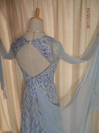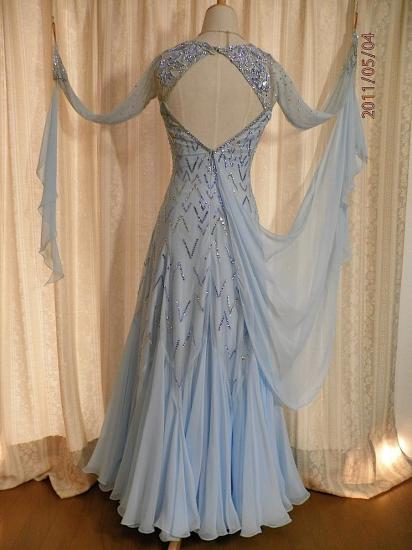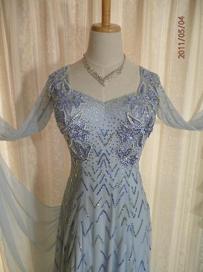 優しい水色のスタンダードドレスです。上半身にはお花のモチーフが美しく配置され、スカートの切替え位置までブルーとシルバーの石で豪華に埋めつくされています。