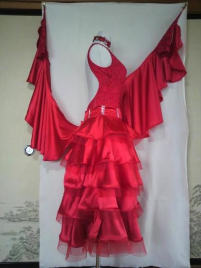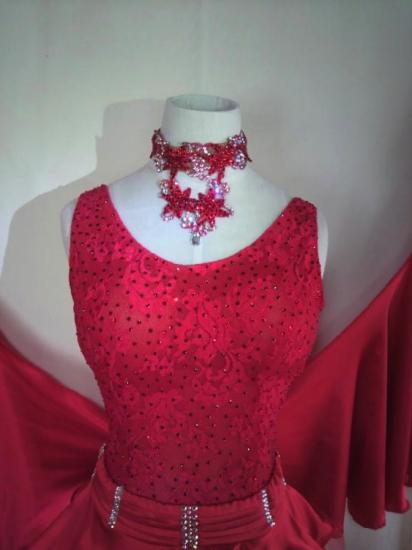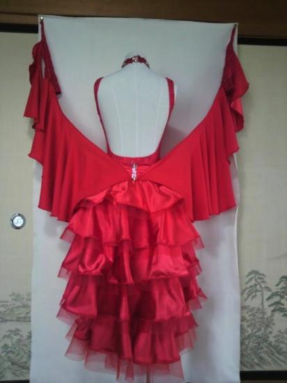雑誌(ダンスタイムVol.2)に、目立つドレスとして掲載されました。写真はややピンクがかって見えますが、実物は真っ赤に近いです。