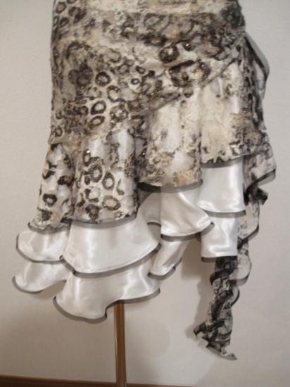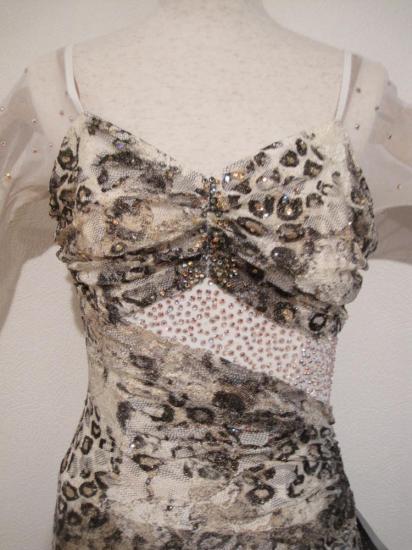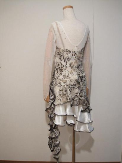 白と豹柄の露出が少ないながらもとてもスタイリッシュなドレスです。きれいな白に胸の部分にスワロフスキーが敷き詰められているので、フロアでとても映えます。裾の縦フリルが揺れて動きをよく見せます。とても好評なドレスでした。