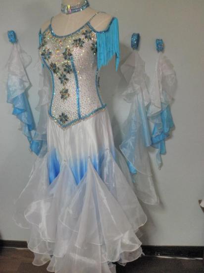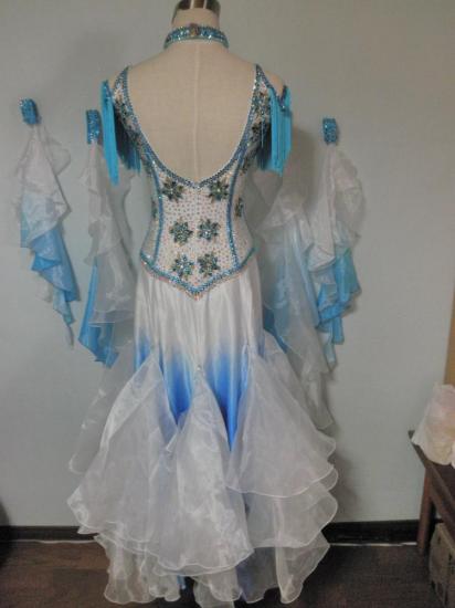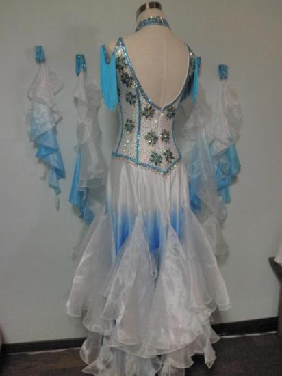 白とブルーのグラデーションがさわやかなドレスです。ボディには石が敷き詰められており、とても輝きます。
