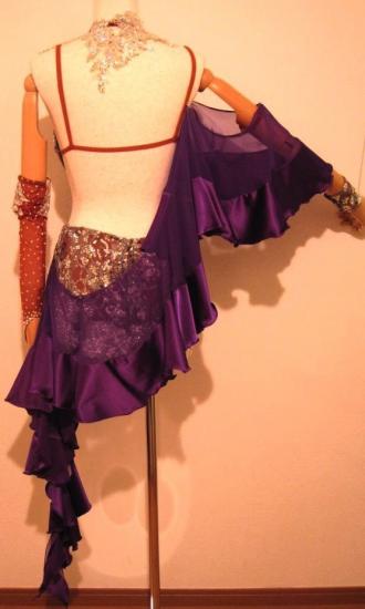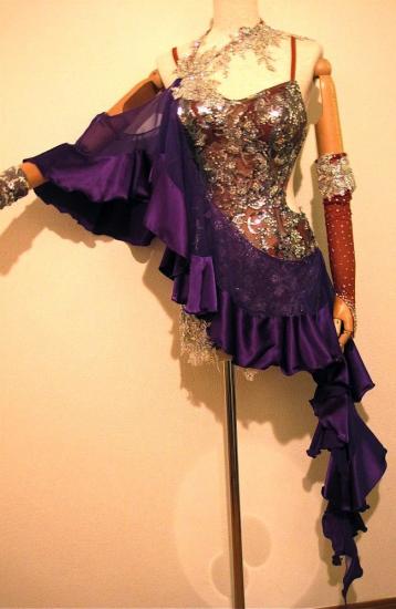 シルバースパンコール地にオーロラストーンで飾られ、全体がとても輝くミニ丈ドレスです。右腕からボディ、左ヒップにかけての紫のドレープ(パールシフォン+ジョーゼット)が特徴のドレスです。長く伸びたドレープがよく動きます。アシンメトリーなデザインなので、スタイルがよく、背が高くみえます。マネキン写真は少し色味がくすんでいますが、実物は着用写真に近く、とても発色のキレイな紫です。