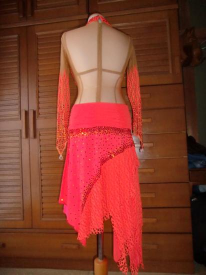 ホルターネックのデザインですがベージュネットでカバーされていますので露出を避けたいアマチュアダンサー向けかと思います。生地と同色のラインストーンが沢山付いていますので上品な華やかさがあります。サイズはM?Lまで大丈夫かと思います