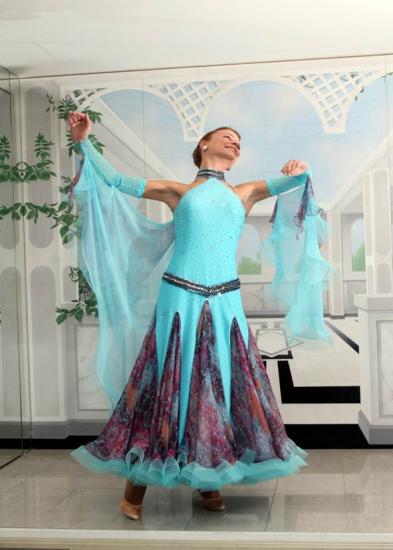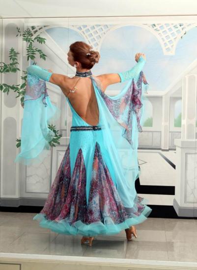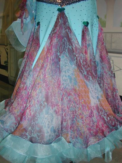 トップはストレッチ素材、スカートはピュアシルクのプリント地、オーガンジーの2 枚からなっています。スワロフスキーを約20グロス使用しています。附属品:イヤリング、ヘアアクセサリー、キモノ(新品、色指定は不可)、ケース(ロング衣装ケース、大バッグ、小バッグ計3個)は新品をおつけします。