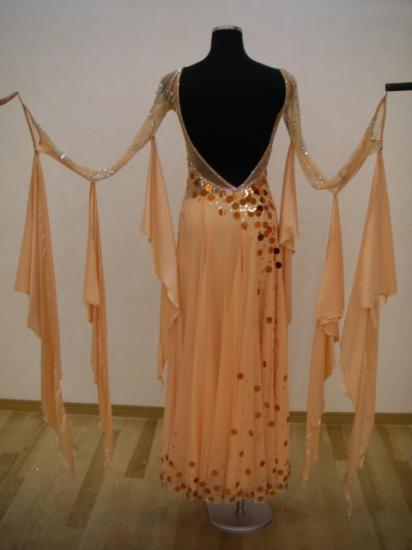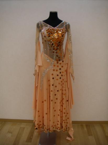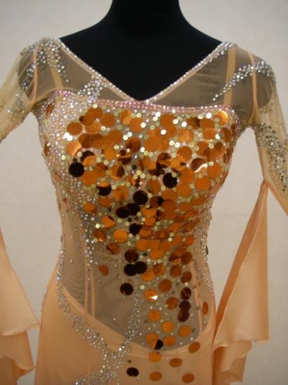スカートが軽くてまわるとスパンコールがキラキラと輝いてとても綺麗なドレスです。アームにはスワロフスキーで模様が描かれていて大変豪華なドレスです。石は、すべて張替えました。上半身のネットは、ストレッチがきいていてファスナーも無く大変着やすいドレスです。