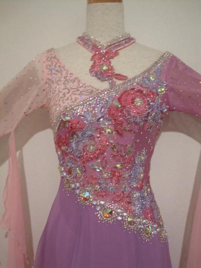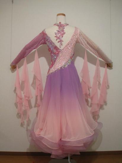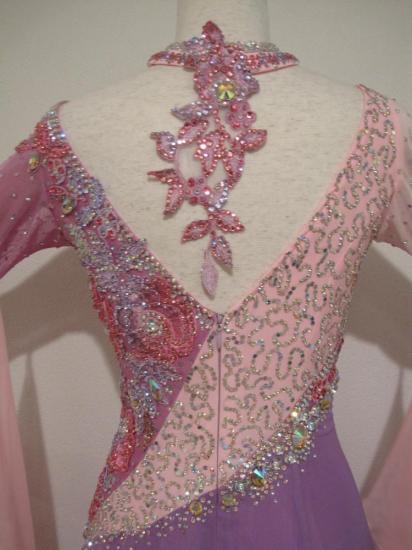 ピンク〜紫のグラデーションが美しいドレスです。スカートはホースヘアが2重になってついているので、裾が軽くよく動きます。ネックレスやボディもストーンとスパンコールで飾られており、豪華です。フロートも大きすぎず邪魔にならず、踊りやすいドレスです。新品ですが、着る機会がなくなってしまったので、お譲りします。