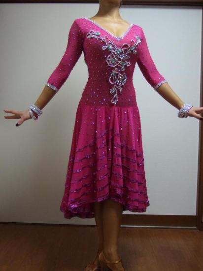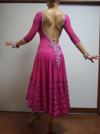 全日本プロファイナリスト原静先生のドレスです。ワンピ型でラインが美しく、上品な印象です。ドレスの全面にストーンがついていてよく光り、目立ちます。