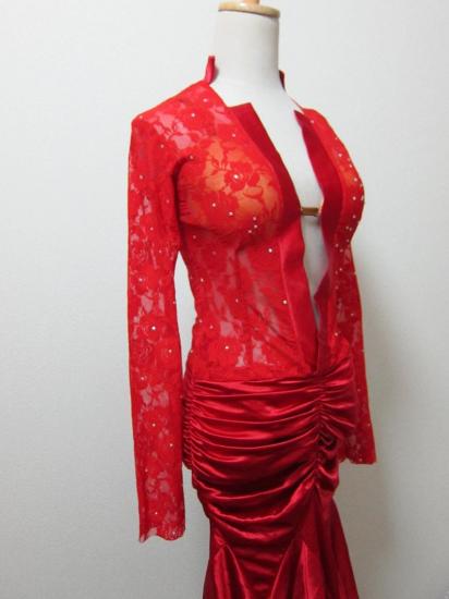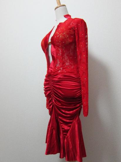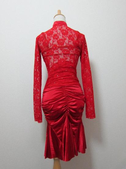 赤レースと赤サテンの露出の少ないドレスです。スカートの形によって、ヒップのボリュームが出て、スタイルがよく見えます。ミニデモやパーティなどにもおすすめです。石は少ないですが、ご希望によって、Vネックの部分にオーロラストーンなどを貼ると競技でも使えると思います。パット付きで胸元に安心感があります。試作品にて新品ですが格安にて販売いたします。