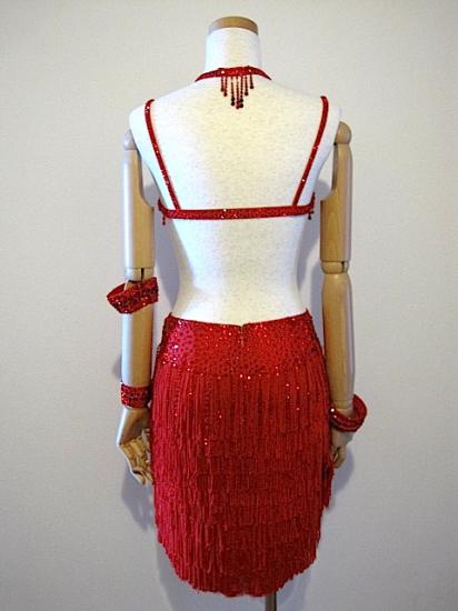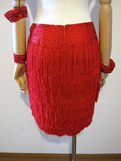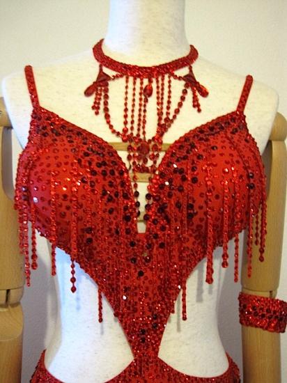 赤のスワロフスキーストーンが全身についており目立ちます。スカートはフリンジの膝丈で段が入っており、よく動きます。腕輪2つ、バングル5つ、ピアス付き。