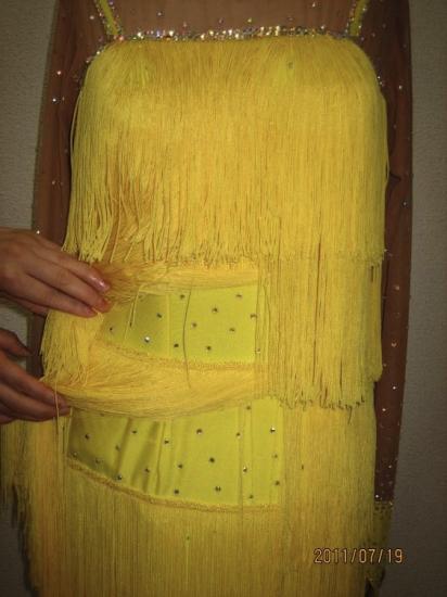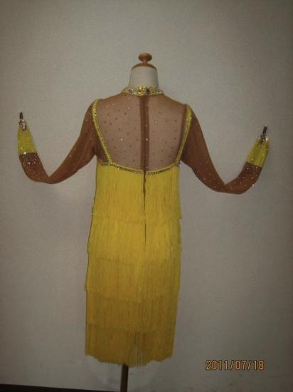フリンジが踊るドレスです。ボディにも石がついているので、踊るとフリンジが揺れるたびに光ります。背中?腕もボディネットに覆われているので、露出を控えたいかたにもおすすめです。