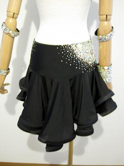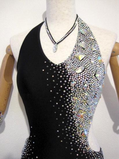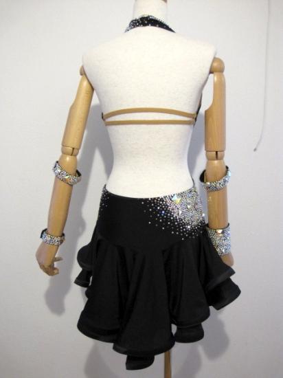 "胸元とバングルにストーンがビッチリついた黒の上品且つ華やかなドレスです。スカートもよく踊ります。ネックレスとバングル4つ付き。