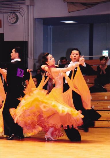 スカート3枚に全てホースヘアがついており、とにかくよく動くドレスです。左半身が赤いスワロフスキー、右半身がオーロラのスワロフスキーでグラデーションになっています。ドレスのデザインは元全日本チャンピオン(モダン)の先生に全てお願いしましたので、目立つ事間違いなしです!