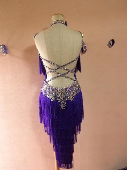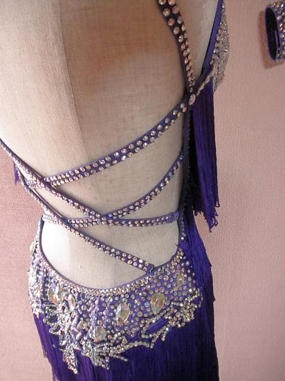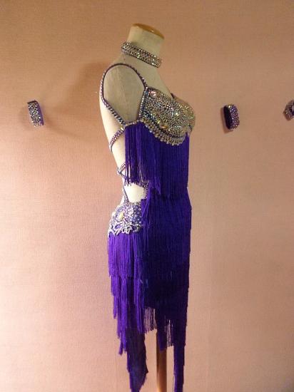 紫のロングフリンジドレスです。胸元とバックのスタイルには沢山のストーンが敷き詰めてありとても輝きます。チョーカー、腕輪4つ付き。
